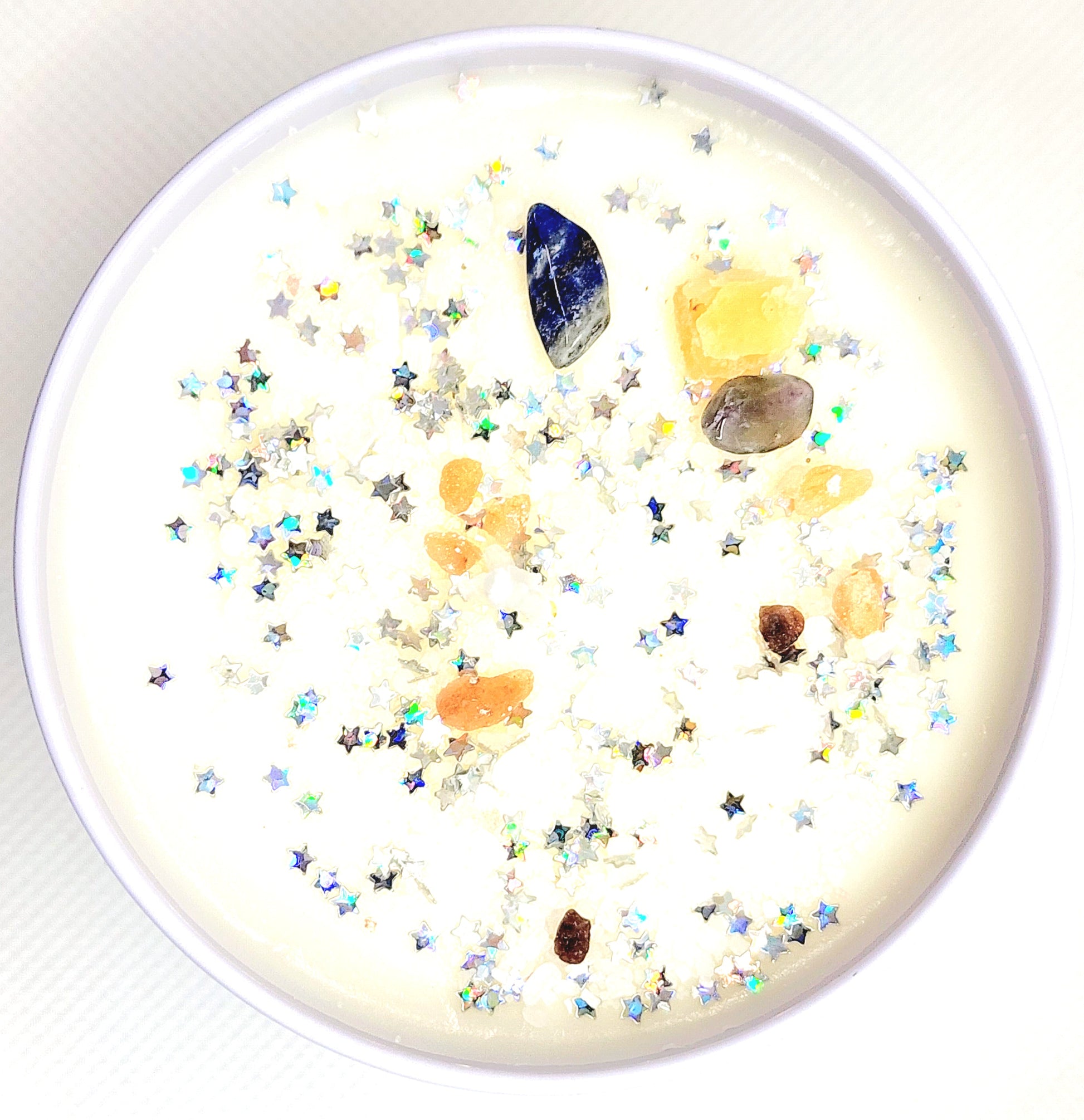 This candle is approximately 8oz, with a fresh crisp aroma with hints of vanilla. This candle has been spiritually treated and enhanced with Epsom salt, black salt. pink salt, tigers' eye, black obsidian crystals and other magical ingredients.